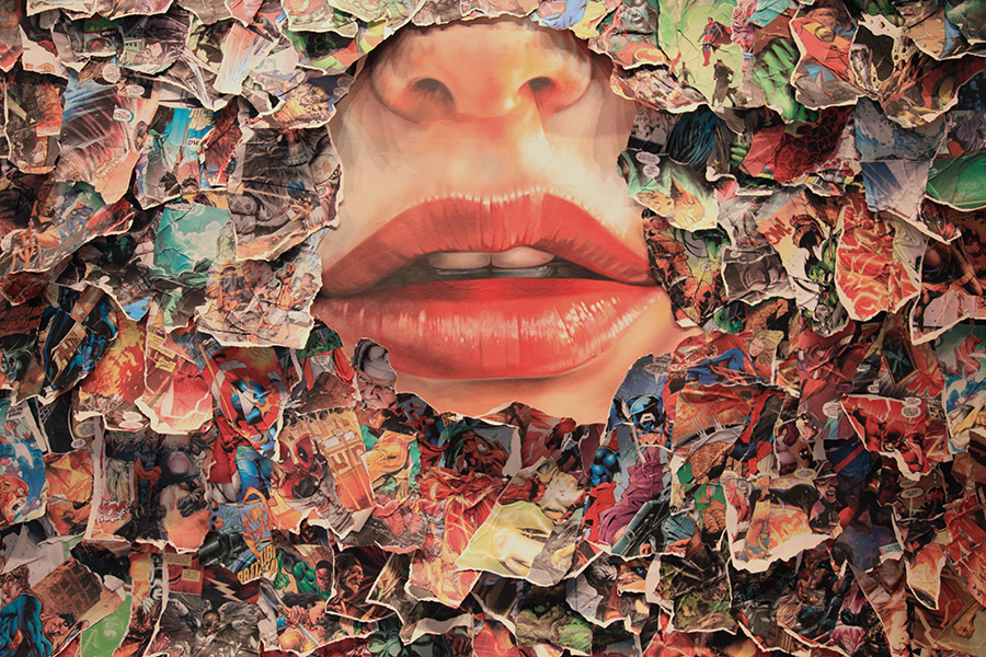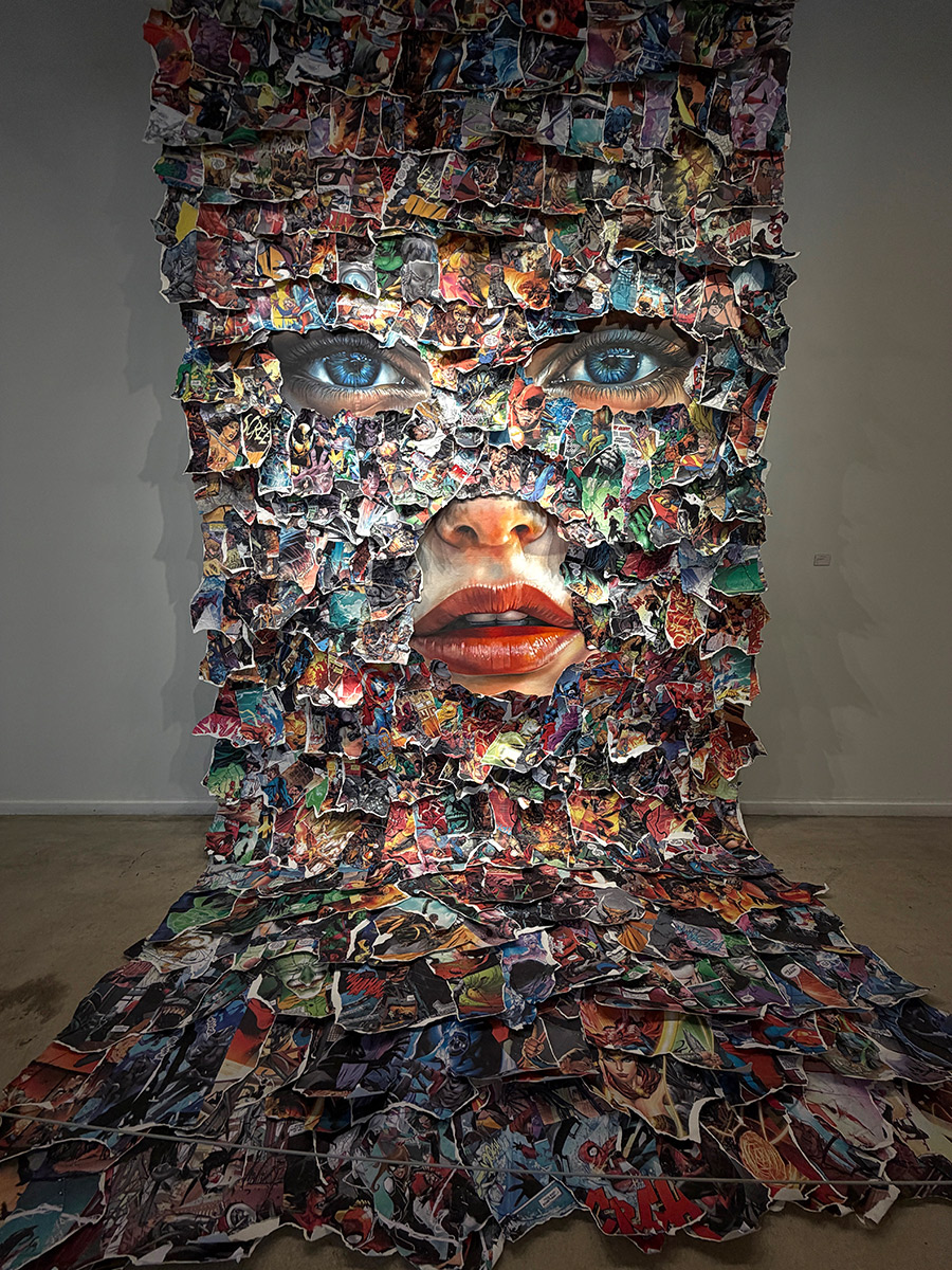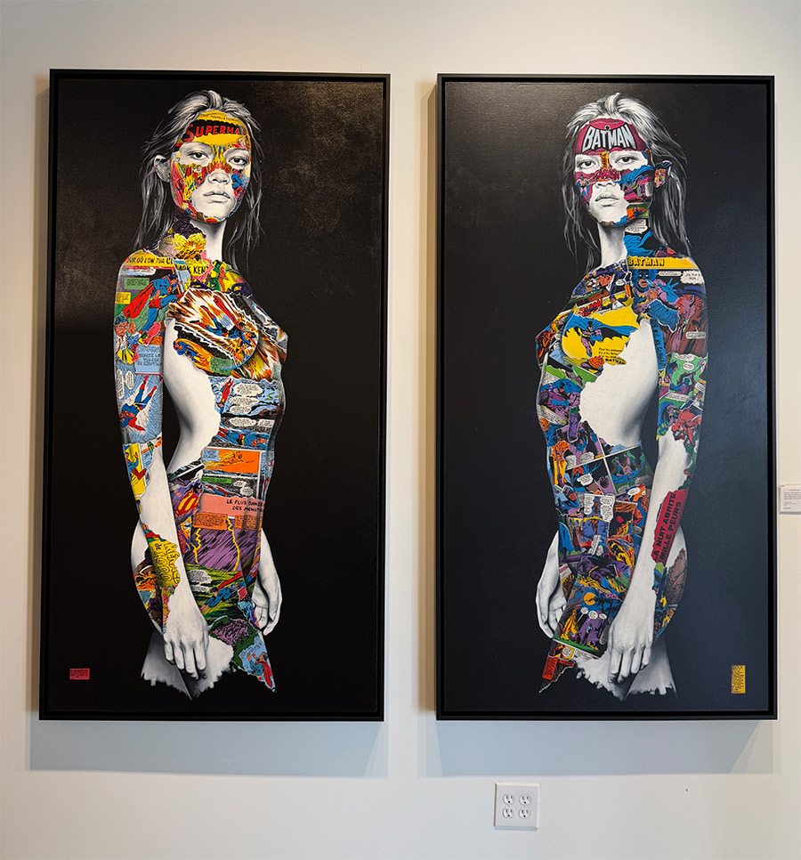 Sandra Chevrier, exhibiting mixed-media portraits that layer comic-book imagery over the human figure, using those fragments to address identity, social/psychological pressure, and the public narratives imposed on private lives