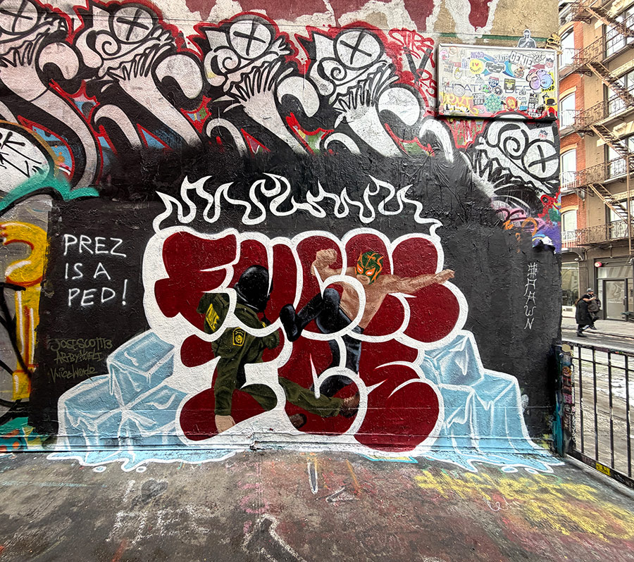 Murals like this new one in Manhattan, and an earlier example in Bushwick, have been appearing in cities including Washington, Miami, Los Angeles, and Chicago, depicting Iryna Zarutska, a victim of violence in Charlotte last summer. The campaign positions her death as a reductionist symbol within a broader, loosely defined narrative that unrestrained “street” crime has overtaken American cities. Her image — carefully selected and conventionally appealing to a certain segment — functions as a cherry-picked face for that message, which some critics view as echoing earlier eras of racially coded fear-based rhetoric that is on display again. Members of Chicago’s Ukrainian community have also pushed back, describing the murals as a cynical tactic and noting, according to local reporting, that the victim’s family was not consulted. The Guardian says the funders have ties to the MAGA movement and billionaire Elon Musk, and it asks, “Are they weaponizing her memory?” The accused attacker’s mom told the local newspaper that her son suffered from severe mental health problems. Whatever the case is, some on the street have decided the whole thing is sus, as the gamer kids say, and have been vandalizing the murals.