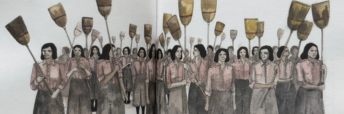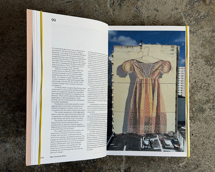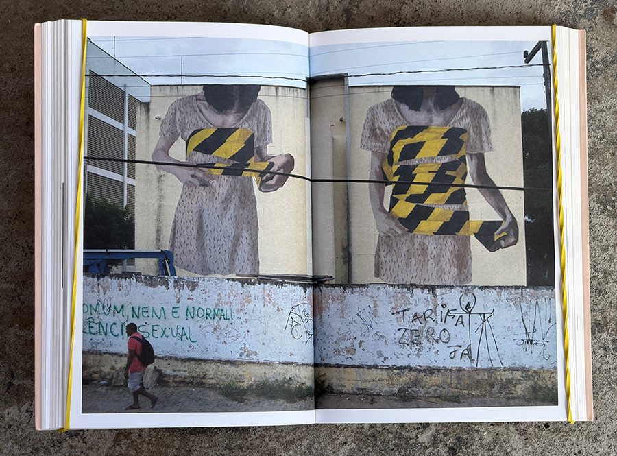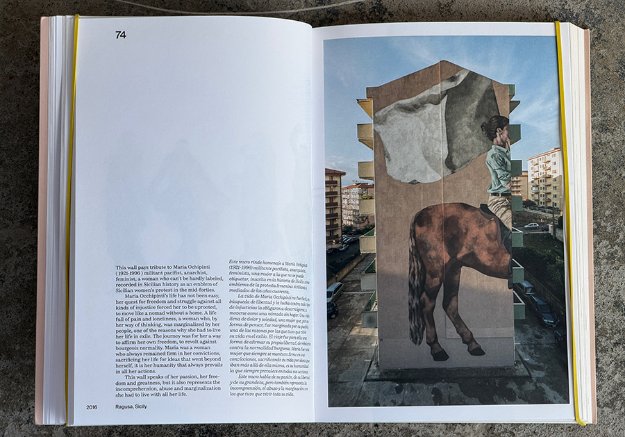 Across its pages, Hyuro’s central concerns appear with clarity: the social conditions imposed on women, the quiet violence embedded in political systems, and the fragile dignity of ordinary lives. With descriptive texts and personal observations, the writing make these motivations explicit. A mural in Fortaleza, Brazil examines the criminalization of abortion and the way the female body becomes “usurped territory” by the state; another, in Monteleone di Puglia, recalls a wartime uprising led by women protesting food restrictions under fascism. Elsewhere she turns to children affected by war, neighborhood life shaped by urban development pressures, or the internal contradictions that shape our identities. These are not decorative murals but acts of witness—images that look closely at, plainly reflect through metaphor and allusion—injustice without theatrical exaggeration.