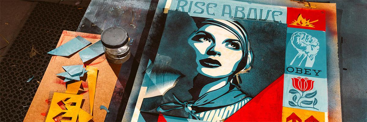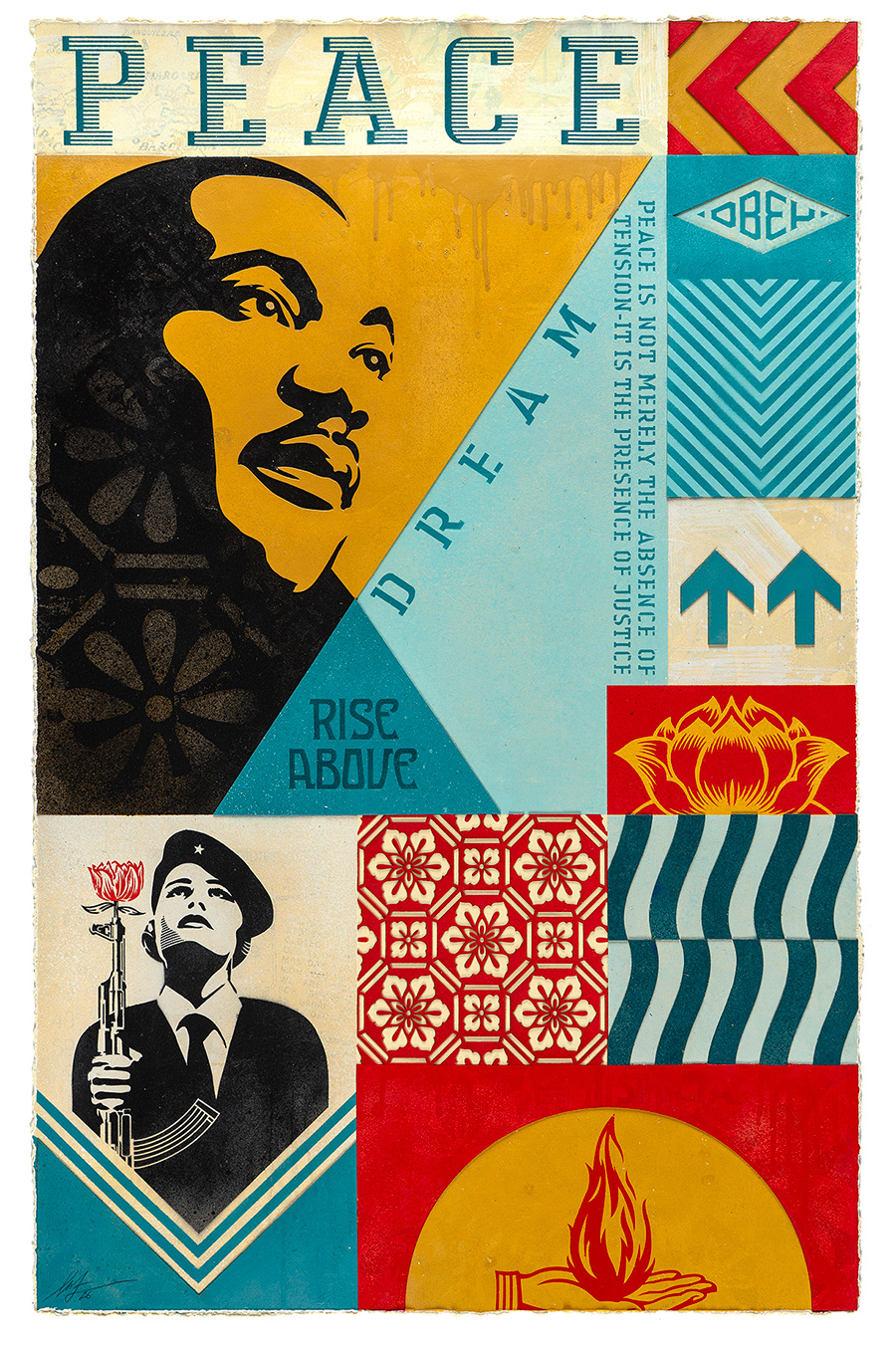 Fairey’s own framing is rooted in the experience of living inside a constant feed. “I’m confronted with an overwhelming number of images and messages daily,” he says, and these works feel like a mature and practiced response to that condition: taking the barrage and compressing it into symbols you can hold in your mind—icons and archetypes that keep circling back to peace, justice, and environmental responsibility. Hung in salon-style groupings that orbit shared themes, the installation lets the pieces talk laterally, collectively radiating like planets in the darkness—separate bodies, shared gravity.