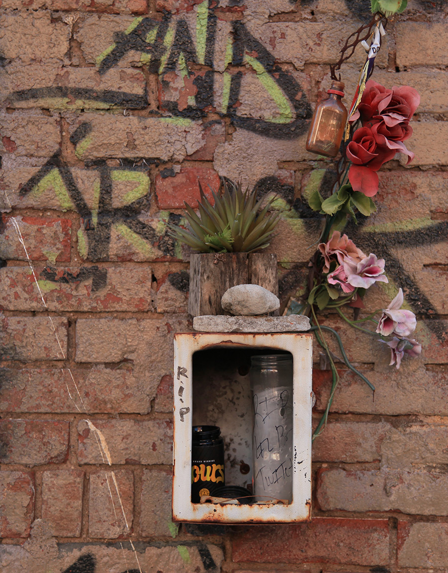 Folklore scholarship on spontaneous shrines helps name what’s happening here. As Jack Santino writes in Spontaneous Shrines and the Public Memorialization of Death, these are public forms of mourning that invite participation from those who encounter them.