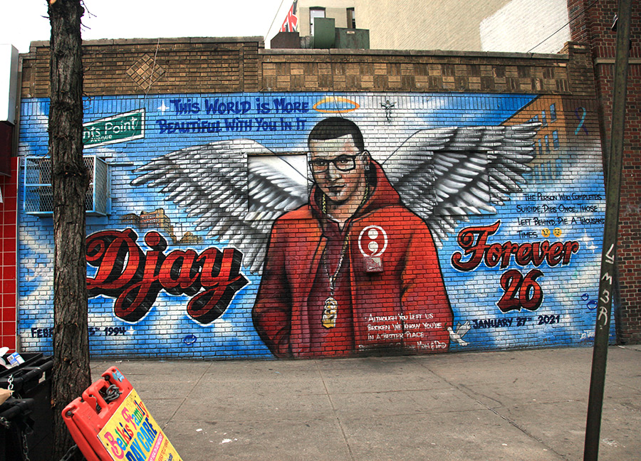 In these recent street photos, the painted tributes read less like “artworks” in the gallery sense and more like public messages—meant to hold their place long enough for the neighborhood to recognize itself in them. The visual grammar is consistent across New York’s “Rest in Peace” walls: the portrait (often larger-than-life), the name set like a headline, the dates, the short dedication, and then the personal details—favorite colors, a car or bike, a sports logo, a prayerful phrase, a few chosen symbols—that insist on a whole life rather than a police report or a death notice. Accounts of these murals emphasize that they frequently avoid explaining the cause of death; the point is the person as they were loved, and the fact of absence as it’s felt on the block.