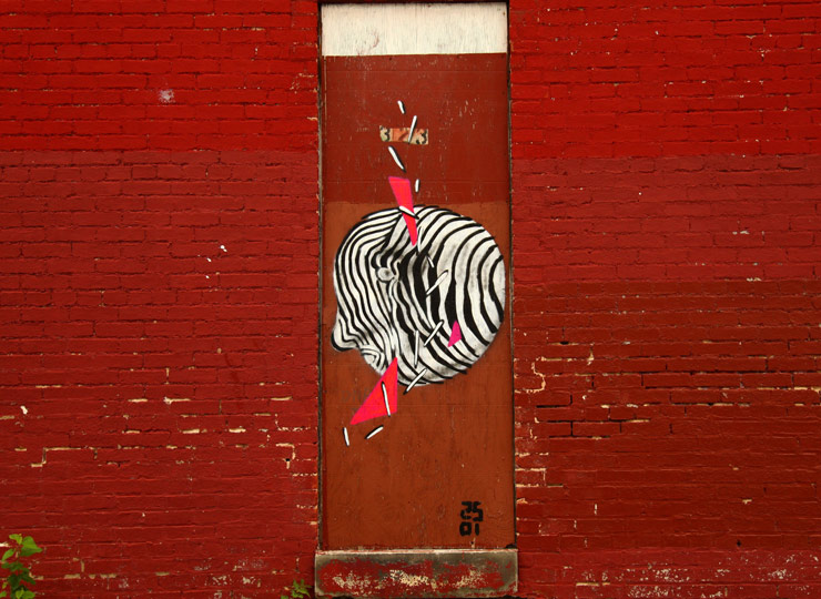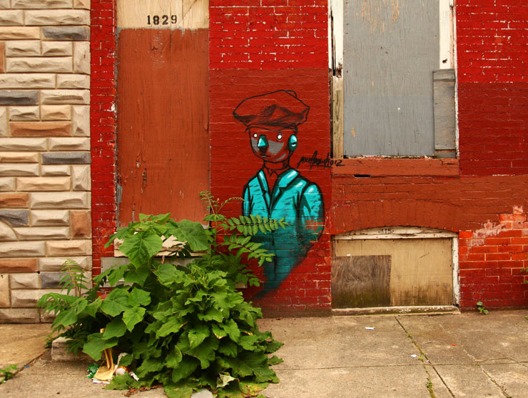 New York Street Artist Gaia had been racing his fixie around this town since he started studying at Maryland Institute College of Art (MICA) a few years ago. In between trips back home he began hitting walls with his large scale paste-ups on sides of some of the abandoned buildings that comprise entire blocks in this city. Somewhere along the way he gradually fell in love with the neighborhood and it’s lively conversations on the stoop, secret speakeasies on the weekend, and eclectic shows with Dan Deacon and the Wham City Arts Collective.