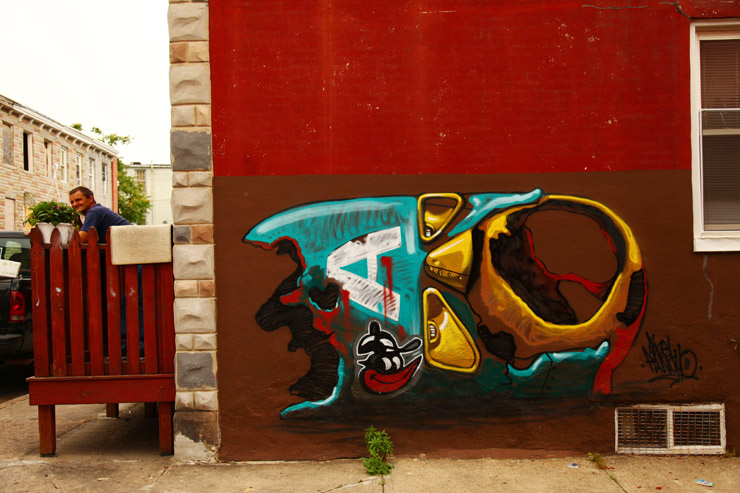 Freshly graduated, the talkative 23 year old artist with a natural knack for organizing decided to stay in B’more and plot a Street Art revitalization of sorts. With Ben Stone and Rebecca Chan of Station North Arts & Entertainment as partners, the trio secured monetary backing and city support for 20 artists to come and paint murals this spring. When asked if the grand outlay of almost a hundred thousand dollars is a civic/private program, Gaia is quick to answer, “Totally private. I guess you could call it civic because they’re non-profit.”