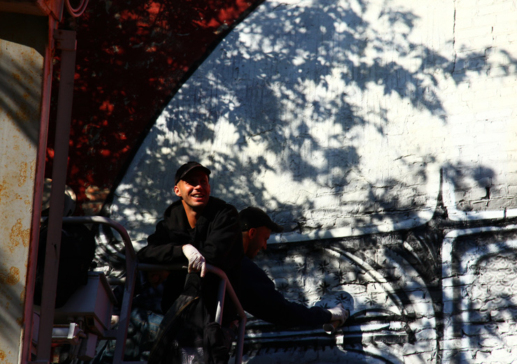 Cosmically or maybe even comically enough, as ROA was working up in the lift adding detail to the animal laying on its back, a man associated with the building’s owner shared an anecdote of how a couple years back a pesky squirrel’s nest almost resulted in the same building burning down, with firefighters called to the scene and all.