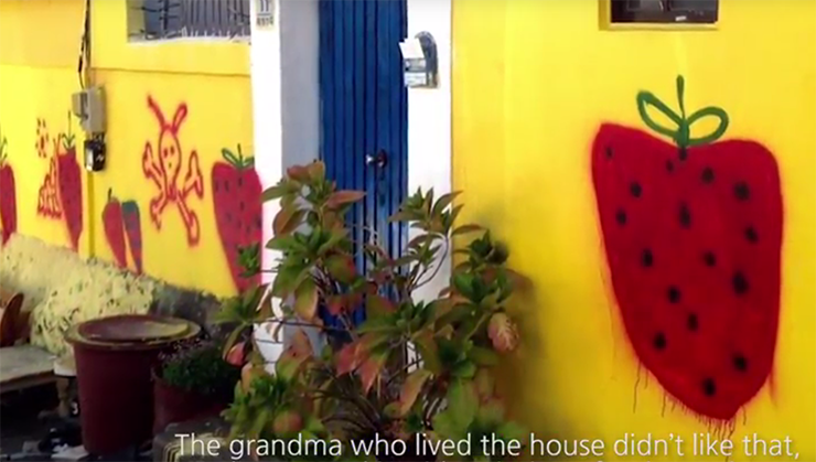 In this video Jazoo Yang and TJ Choe show you how they took inspiration from her act and covered the doomed neighborhood before it was destroyed.