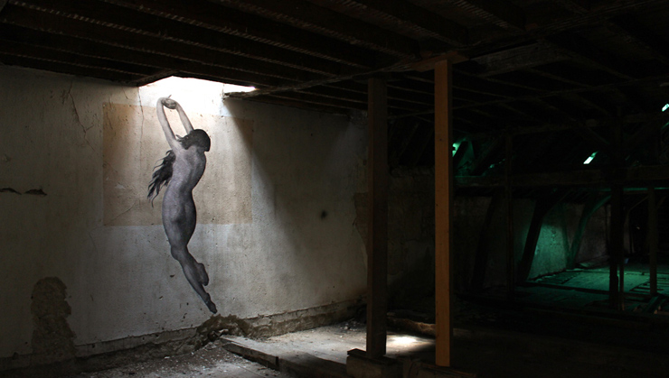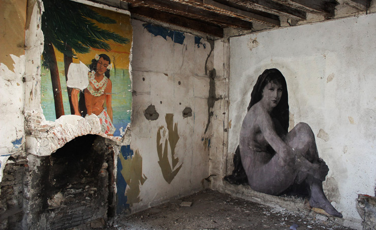 Summer’s final roses are still ripe for the picking here in Brooklyn, with no threat of autumn’s frost in sight and late September sun to illuminate them as you scuffle by on concrete sidewalks. Street Artist YZ lives and works in Montreuil near Paris and has been bringing rooms of an old cabaret alive with roses this summer and shares with us today images of classical figures she painted with india ink on silk paper for these decaying walls.