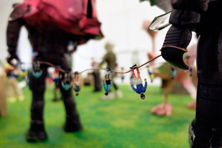 But the weight of historical practices of preservation wrestling with the forces of ephemerous ‘street cred’ is like matching a tyrannosaurus with a Transformer; which is why the “TOYS” diorama in the community show space of an advertising/production company encapsulates some of their internal dilemmas so perfectly. Seeing the artists themselves as packaged products hanging on the wall commodifies them in a way that is knowingly sarcastic, thrilling, and drowned in irony. Collect all three!