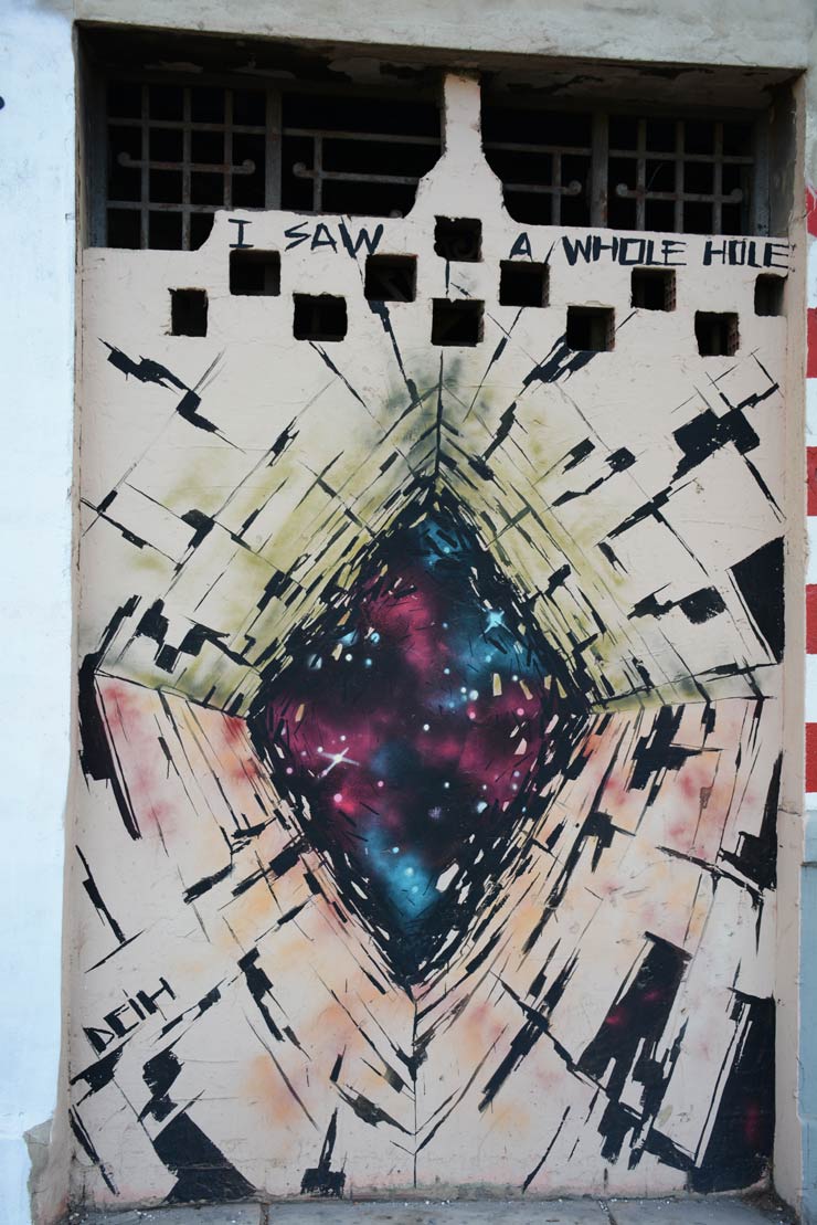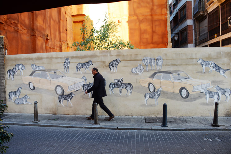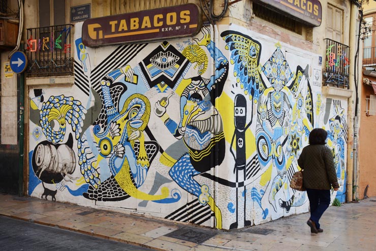 Yes, Valencia inherited the grafiteros romance and hip-hop aerosol aesthetic in the late 20th century, as many cities around the globe did, and you can see ample evidence of those fame and style influences here as well. However there is an almost Lo-fi illustrator vibe in Valencia and many figurative pieces are singular, influenced by cartoons and modernly ironic illustration styles, from deadpan dry in black, grey, and white to fully realistic and photorealist aerosol portraits.