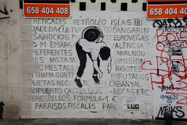 It is not unusual for works to have a message or point of view, where symbols stand in for sentiments and metaphors abound. The “cute” quotient may also be lower than many cities, as is the need to fill in a background to occupy space. In a genre that can get very cluttered, with pieces chock-a-block and smashing into one another with no discernable through-thread, Valencia looks like it can give artists the space, and artists are using that space effectively.