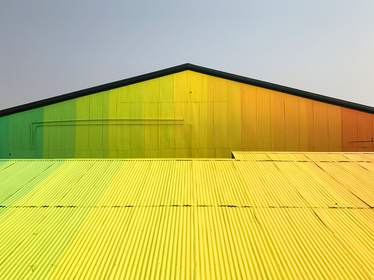 He calls it ‘Exterior Intervention 1 : angle of incidence’ and says that it “is a site specific composition based on the use of light as a means to detect and decipher motion (Red shift / Blue Shift). This common measure for the direction of a galaxy/star/object/particle as it moves through space and time realized in the form of 21 values from blue to yellow, and finally red across the longest side of the site.”