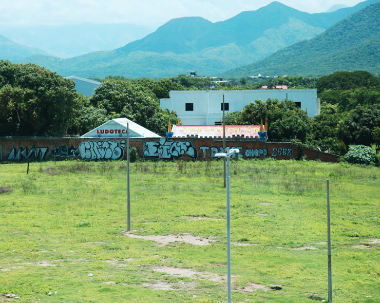 “Okay, perfect,” says the agreeable M-City, who quickly begins sourcing paint in a nearby pile of cardboard boxes. As a Street Artist who is curating this first phase of painting at this old Colombian distillery for Dictador Art Masters Foundation, he is helping others to hit their goals as much as he is directing his own creative work. Finally the collaboration is finished and it beams across the drying muddy field in the sun.