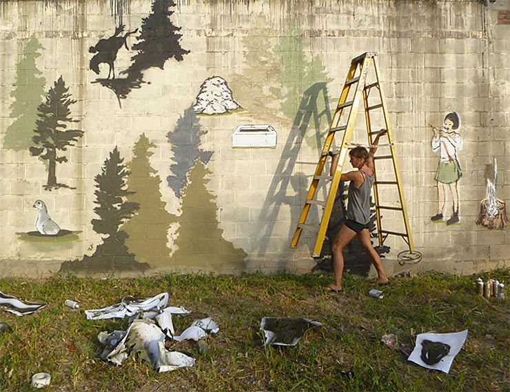 They liked to small town sophisticated vibe and couldn’t believe how nice the people were. “Amanda painted an amazing ‘campground’ scene alongside the Beacon Natural Market,” he says, and he made a new ‘lost object piece’ in the same spot that a Ron English piece had run on for a while. “I also made one small #emogarden called ‘real sweet noise’ while waiting for Mando to get done with her big wall.”