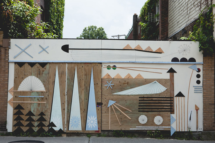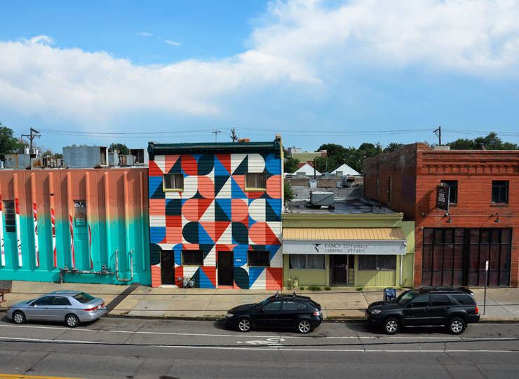 Brooklyn artist and designer Scott Albrecht usually works with collage or wood for his fine art of geometric patterning that hearken an arts and craft modernism of the 1970s. Now he has just completed a mural in Denver reprising his smaller works at a much larger scale – with a little help from the family.