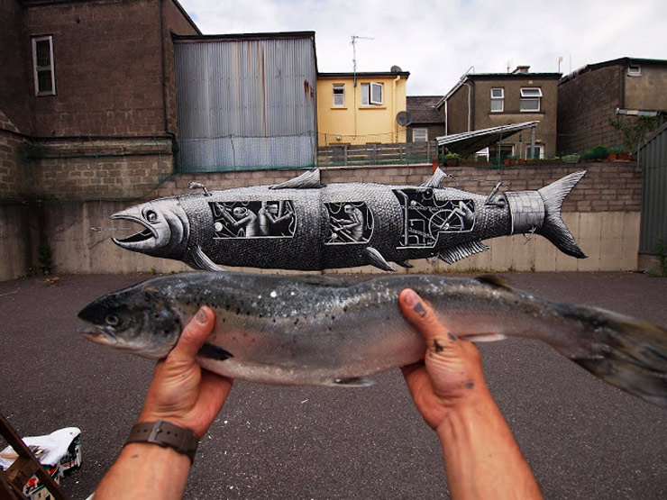 On his recent trip to Bantry, West Cork, Ireland Street Artist Phlegm took advantage of a brief dry interlude, got his painting materials out, rolled up his sleeves and set his magical thinking free onto a couple of walls. Unbothered by the punishing rays of the sun, the palette of black and white emulated the greyness of the days.
