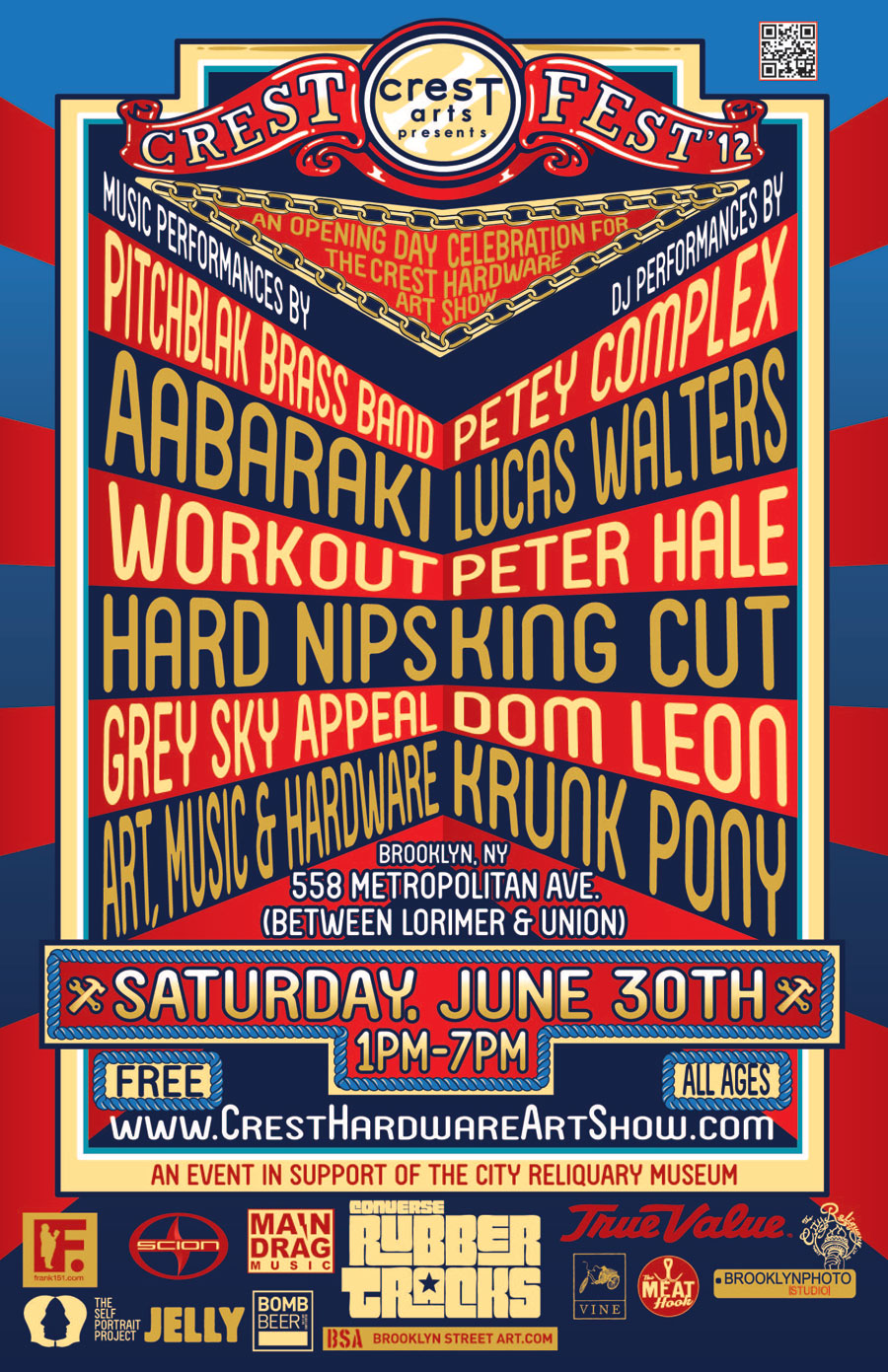 The 11th run of the legendary Crest Hardware Art Show will open on JUNE 30th, 2012. The opening day celebration, Crest Fest 2012, will bring the community together with art, food, drinks, live music and local vendors. This year’s event will take place at Crest Hardware, located at 558 Metropolitan Avenue, in Williamsburg, Brooklyn. Crest Hardware will offer over 10,000 sq ft of indoor and outdoor retail space & storefront windows. As always, submitted work must be about, made with or inspired by hardware.