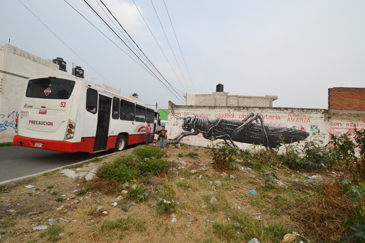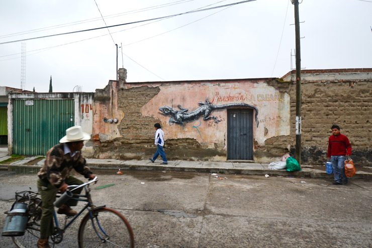 In his second trip to Mexico City, ROA powerfully depicted struggle that commands attention across a large wall. “The snake with rats in her tail strangled. And as Jaime knows, the snake is very important for the pre-hispanic culture in Mexico,” says ROA.