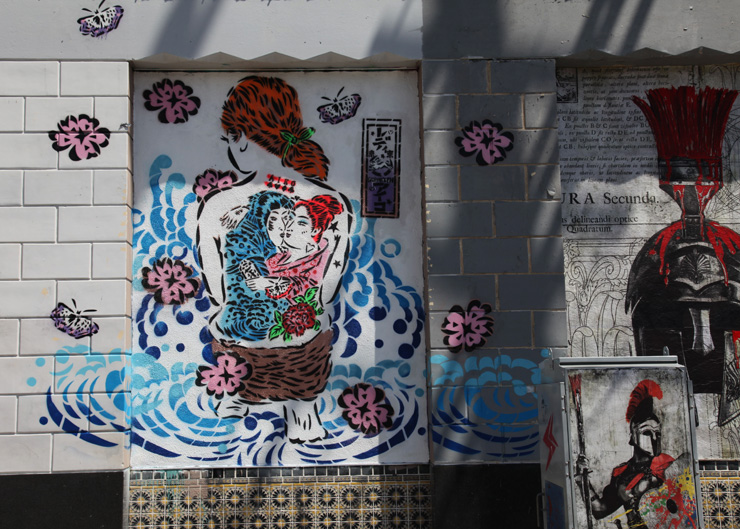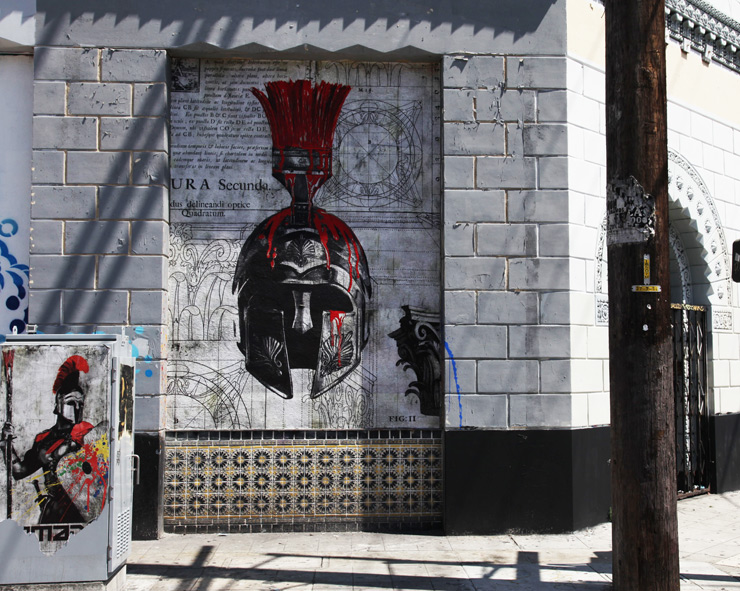 Italian Street Artist Zed1 stays monochromatic in his palette also but his metaphor is entirely different. “I prefer you see when you finish because it is a surprise !” he says while revealing to us in a conspiratorial tone what the humorous scene will eventually depict. Don’t worry folks, it’s all clean and respectful.