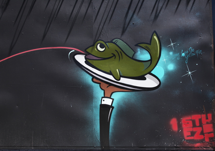 “I’m trying to experiment a little at the moment and in terms of colors I’m just doing strictly gray scale,” says Melbourne Street Artist REKA, who is normally known for his use of vibrant oranges and reds in his tightly fluid character-based street work. “Also this is something a bit more messy, a bit more dynamic anyway – I’m allowing more room for error and be more playful.”