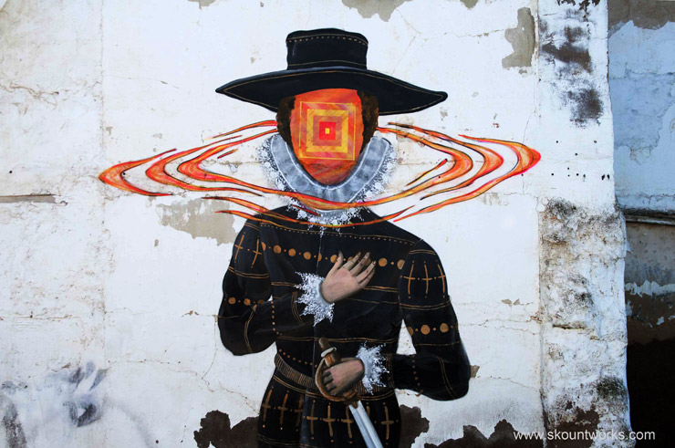 “This historical character is a clear example of how a human being in search of better life, new experiences and knowledge, can become corrupted by power and greed, causing death – and even attract own death,” says Skount of this faceless conquistador now painted in Almagro, Spain.