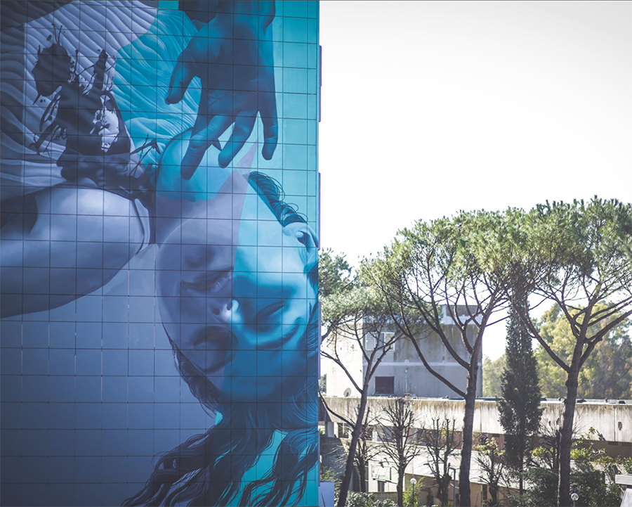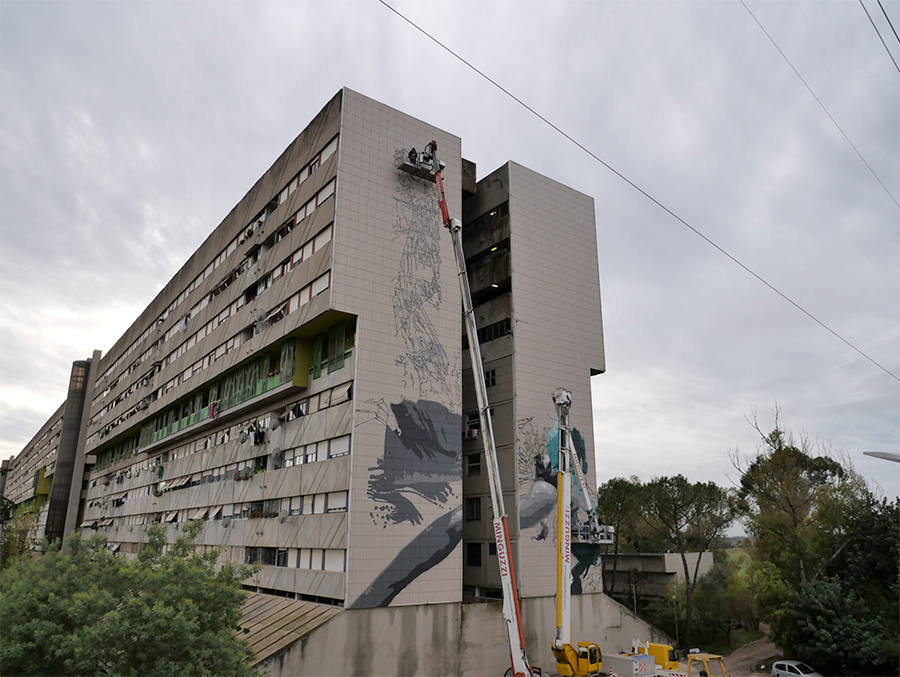Part of the Roman “Street Art for Rights Forum Festival,” the 40-meter mural on the Serpentone in Corviale is meant as an allusion tangentially to the climate crises, says the press release. More directly, it points to an unchecked brutal capitalism that picks winners and losers as it ravages the earth and its people. The mural, organizers say, is “a metaphor for a society blinded by profit, that is heading for self-destruction, aiming for the maximum today regardless of the future.”