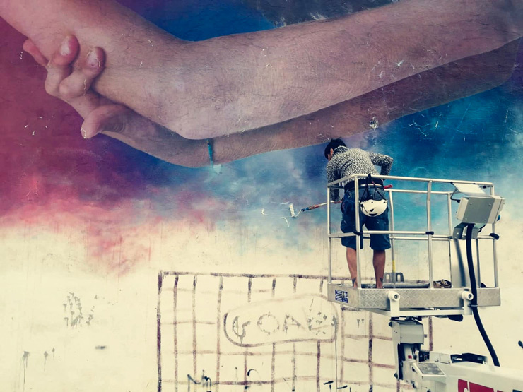 Italian Street Artist Bifido staged one of his theatrical photoshoots with two young actors to create this metaphor for strife in the metaphysical sense, a battle perhaps between good and evil. Organizers say that public art events like this provide impetus for a social gathering around artist expression and ideas, catalyzing discussion and appreciation for art and culture. We particularly like the description on the itinerary under “Social Lunch”, which roughly translated, says “to counter the weariness, the alienation of modern life and lunches of solitude, Saturday we all eat together. Everyone brings something, we sit at the table”.