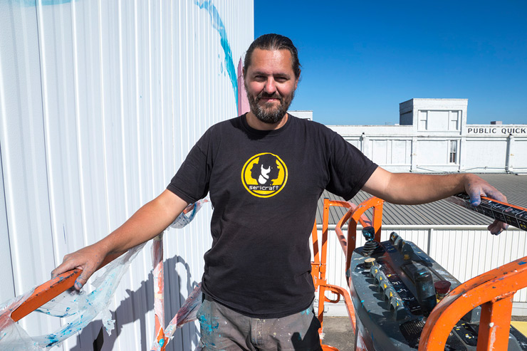 Here in Jacksonville he’s not far from the Atlantic, St. John’s River, Nepture Beach – and the building itself houses a seafood market. With this environment lapping at his ankles wherever he turns, one can easily imagine his influences when conjuring and painting this 38 foot x 150 foot “Eikosi”, his largest mural ever, here organized by Iryna Kanishcheva.