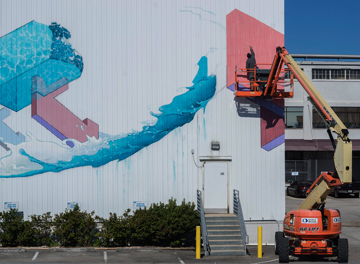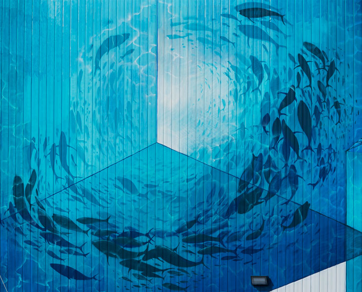 The twenty-sided icosahedron overlooking a stream of cars on the highway is full of rippling, swirling, splashing aqua – something the Turin, Italy based Etnik finds refreshing and in alignment with his urban art practice.