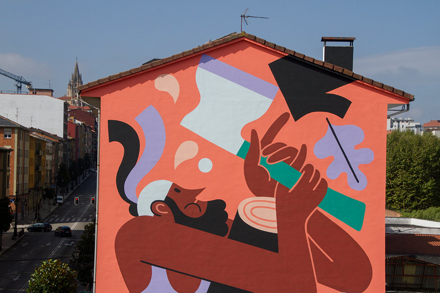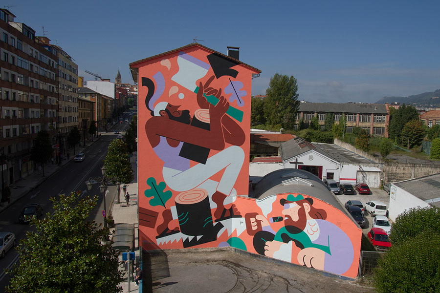 The color palette of the new collection of murals at the 3rd edition of Parees Festival is softened, earthen, stable. Adding five new murals brings the total to 23 here in Oviedo The 3rd edition of Parees Festival in Oviedo in Northern Spain, only minutes from the Bay of Biscay.