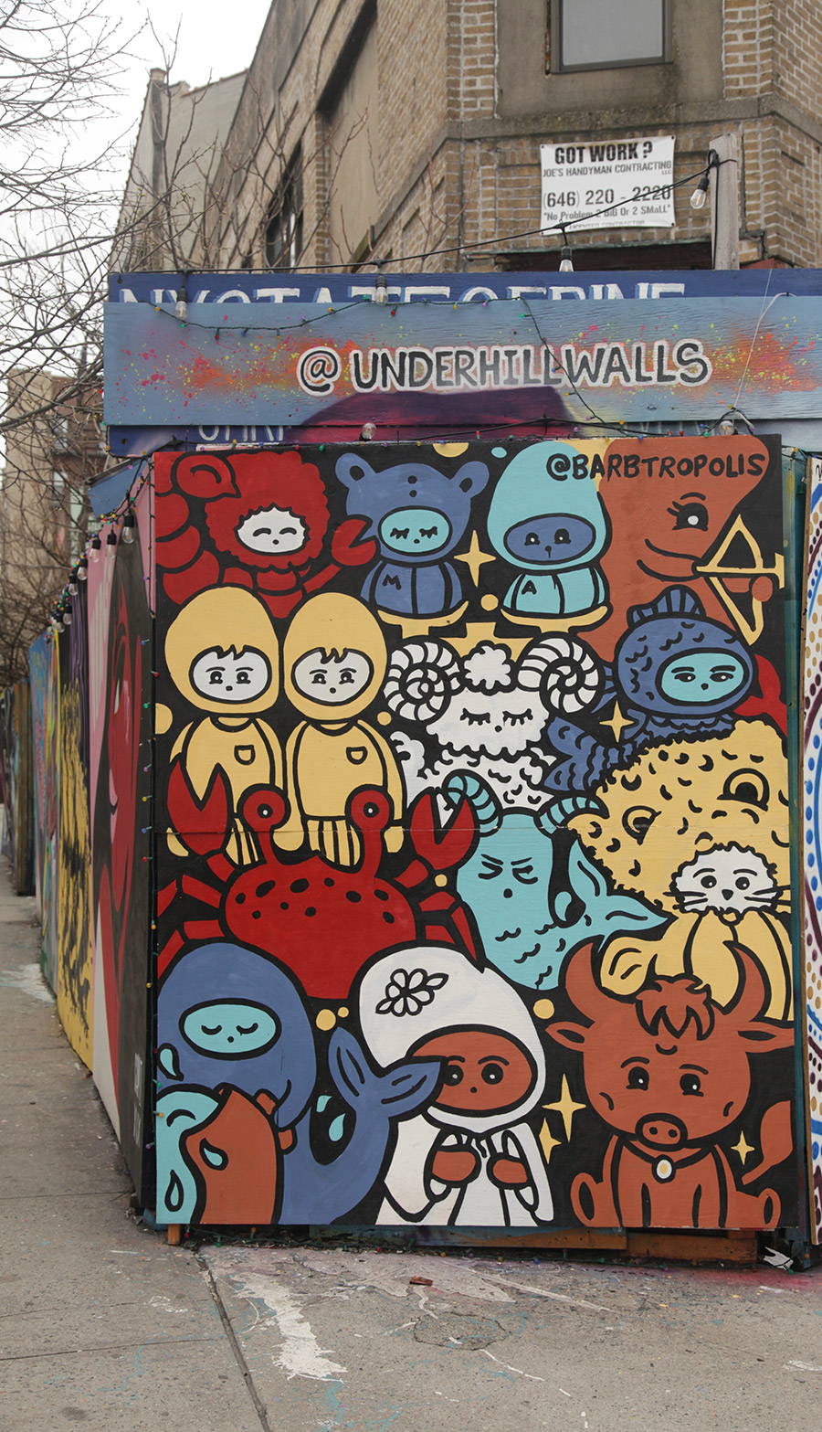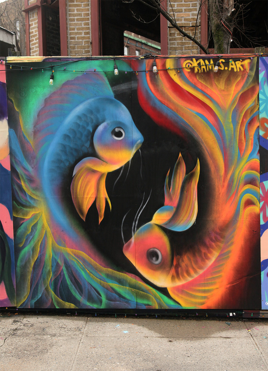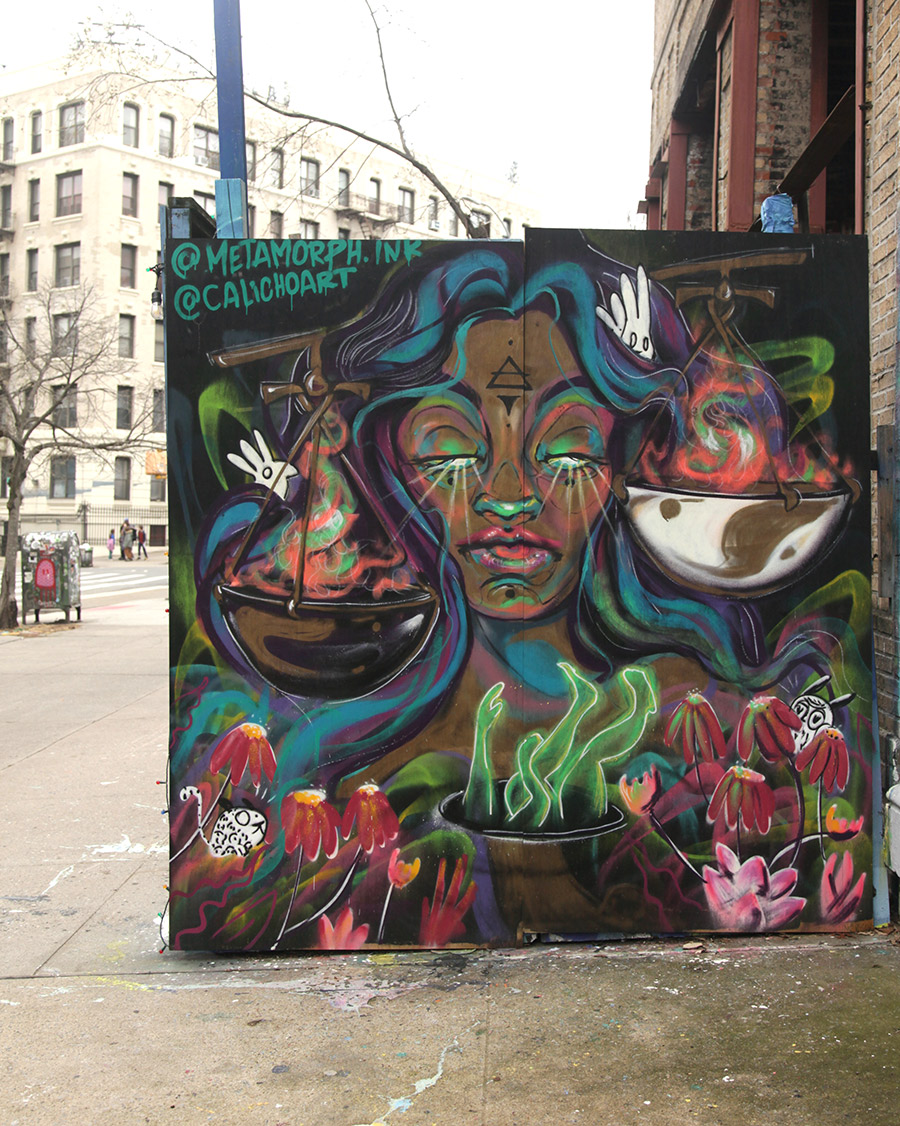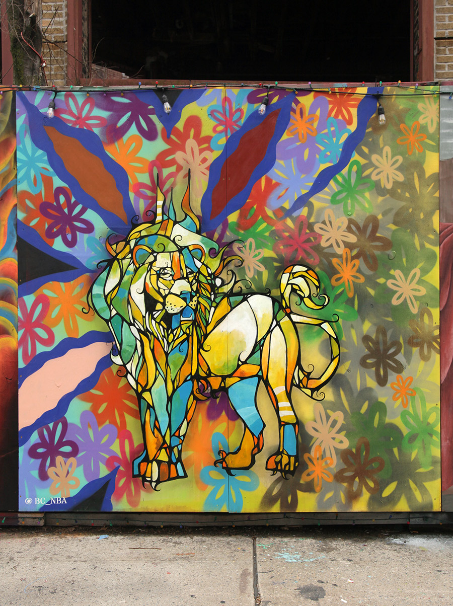 This week, we focus on some of the recent panels from a community wall project that consistently refreshes the view for people in the Prospect Heights neighborhood of Brooklyn. Founded in 2015 by artist and curator Jeff Beler, who developed the site after securing permission to transform construction fencing around a fire-damaged, long-abandoned building into an open-air mural space. The project, initially organized with curator Frankie Velez, operates as a recurring, theme-based installation refreshed roughly twice a year, bringing together a mix of established and emerging muralists to produce site-specific work across multiple panels. A community-based initiative, Underhill Walls has grown into a visible neighborhood fixture and a broader hub for mural production, emphasizing collaboration, accessibility, and artist “chemistry” in selection for the rotating roster.