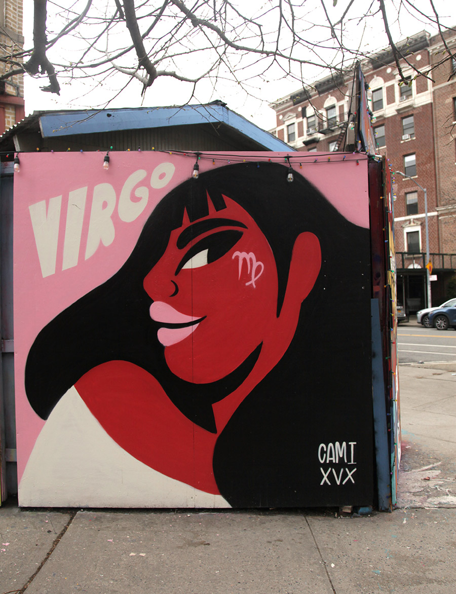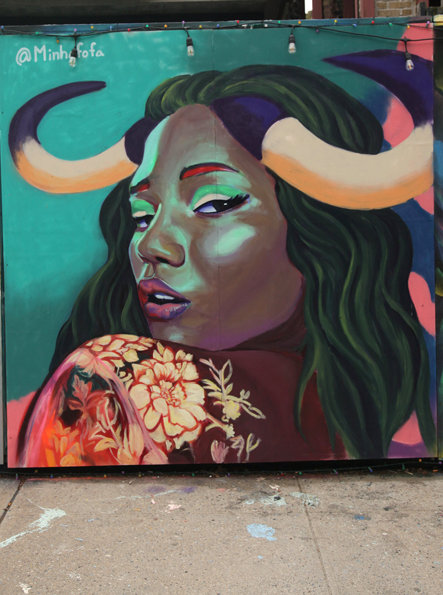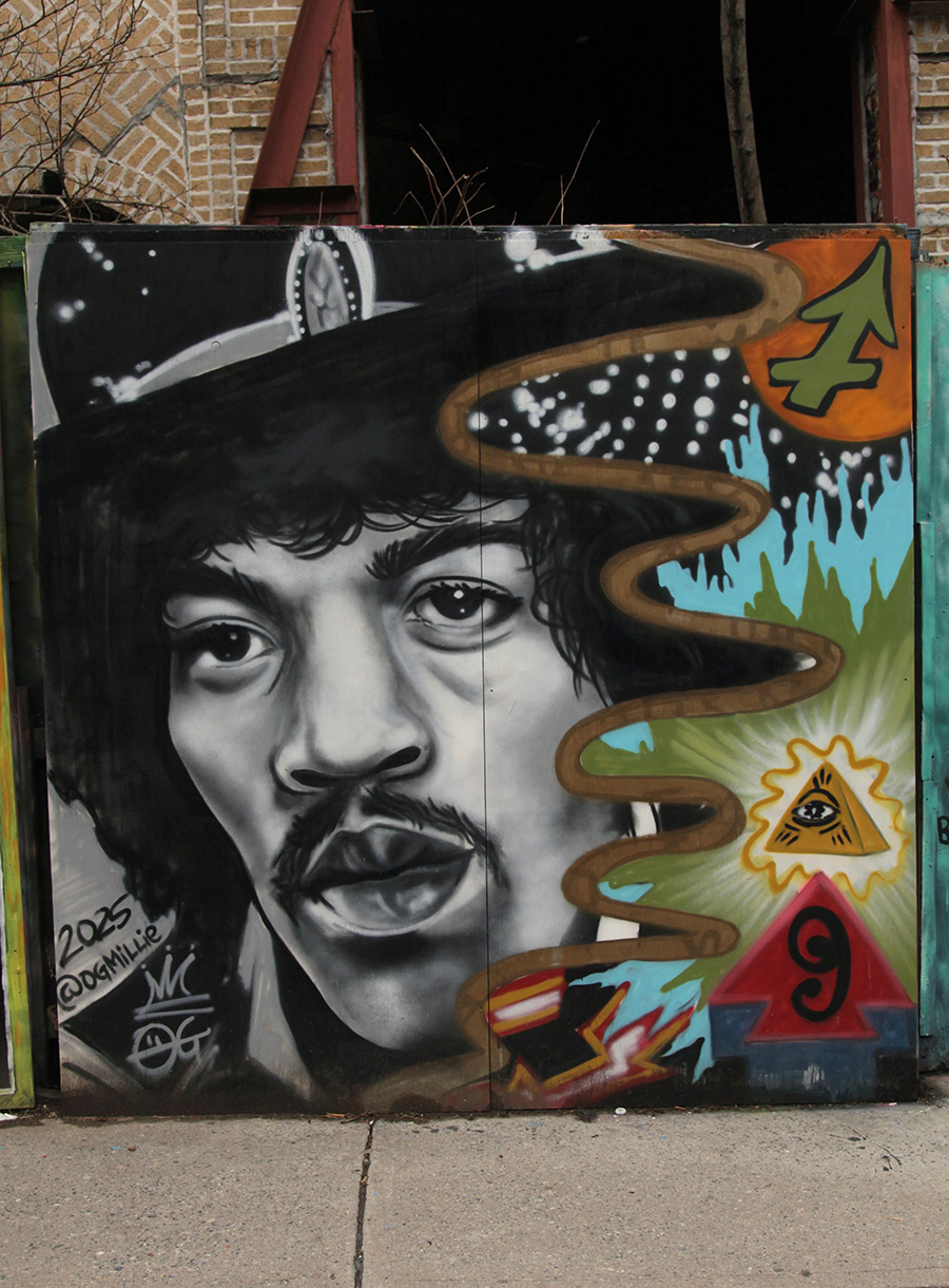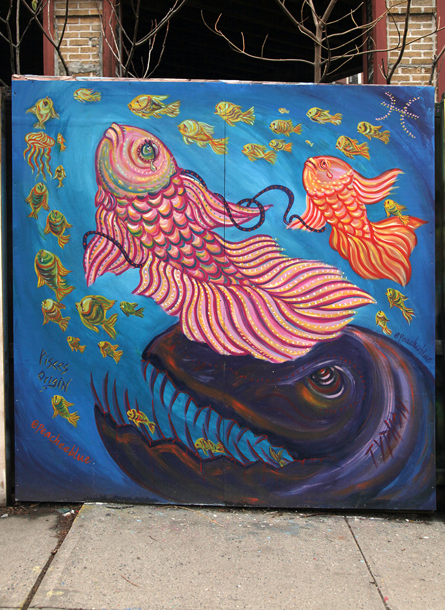 This week, we focus on some of the recent panels from a community wall project that consistently refreshes the view for people in the Prospect Heights neighborhood of Brooklyn. Founded in 2015 by artist and curator Jeff Beler, who developed the site after securing permission to transform construction fencing around a fire-damaged, long-abandoned building into an open-air mural space. The project, initially organized with curator Frankie Velez, operates as a recurring, theme-based installation refreshed roughly twice a year, bringing together a mix of established and emerging muralists to produce site-specific work across multiple panels. A community-based initiative, Underhill Walls has grown into a visible neighborhood fixture and a broader hub for mural production, emphasizing collaboration, accessibility, and artist “chemistry” in selection for the rotating roster.
