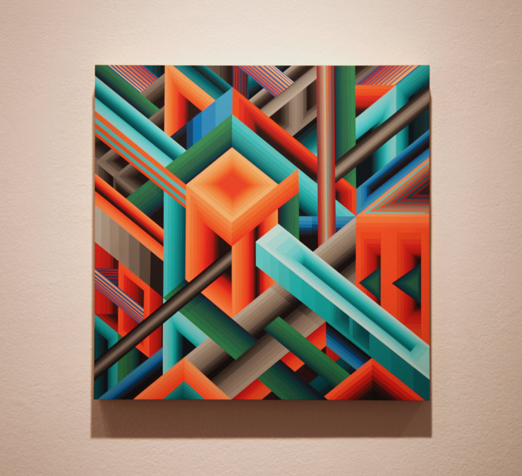 And then there is the patch of seafoam sky, the deciduous limbic form that is not strictly geometric, the shock of hot tomato cheeks… the speckled face of a cat-eyed Doe sunnily perched in her modest bathing suit, or the closely-shorn dome of a white glove architect bending lithely toward his tilted graphite rendering. These are the human elements that anchor the shifting planes, grounding the piece, adding warmth, with good reason.