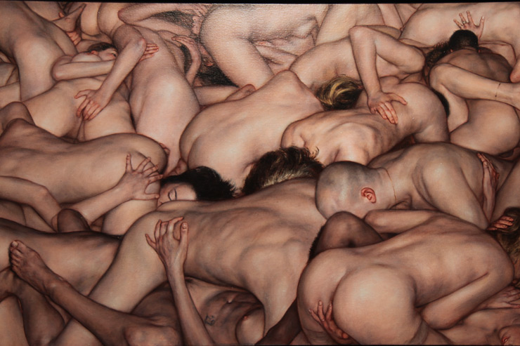 Newly re-mixed and sampled soulful works by Augustine Kofie are featured in the “Inventory” show that just opened here in New York at Jonathan Levine this weekend. No, he’s not looking through his storeroom of canvasses and clearing out old year-end inventory, the name refers to the “controlled hoarding” Kofie goes through to amass the muscles and skin of his 45 degree compartmentalized grid pieces.