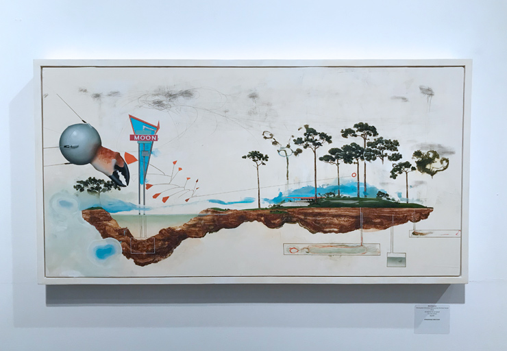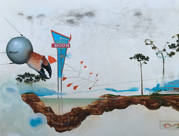 Rick Newton was born in West Palm Beach Florida and received a BFA from the Massachusetts College of Art. Stylistically inspired by scientific textbook illustrations, her presents his personal mythology concerning the future of our world. By incorporating Cold War imagery interacting with animal life set in surreal landscapes, he supposes a world where there has been a shift in hierarchy.