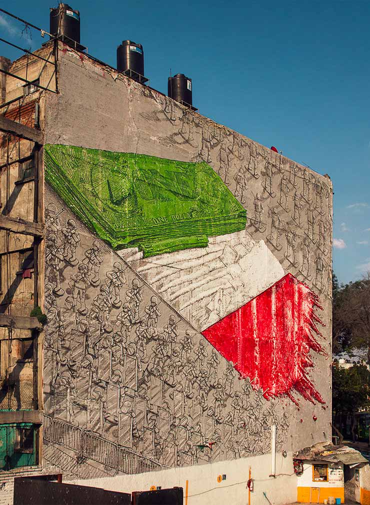No stranger to controversy, the largely anonymous Italian BLU has similarly featured the banded colors of the Mexican flag in his mural but with bluntly acidic criticism – with the green appearing as dollars, the white as lines of cocaine, and the red a dripping liquid similar to blood. Framing the flag are military figures standing guard.