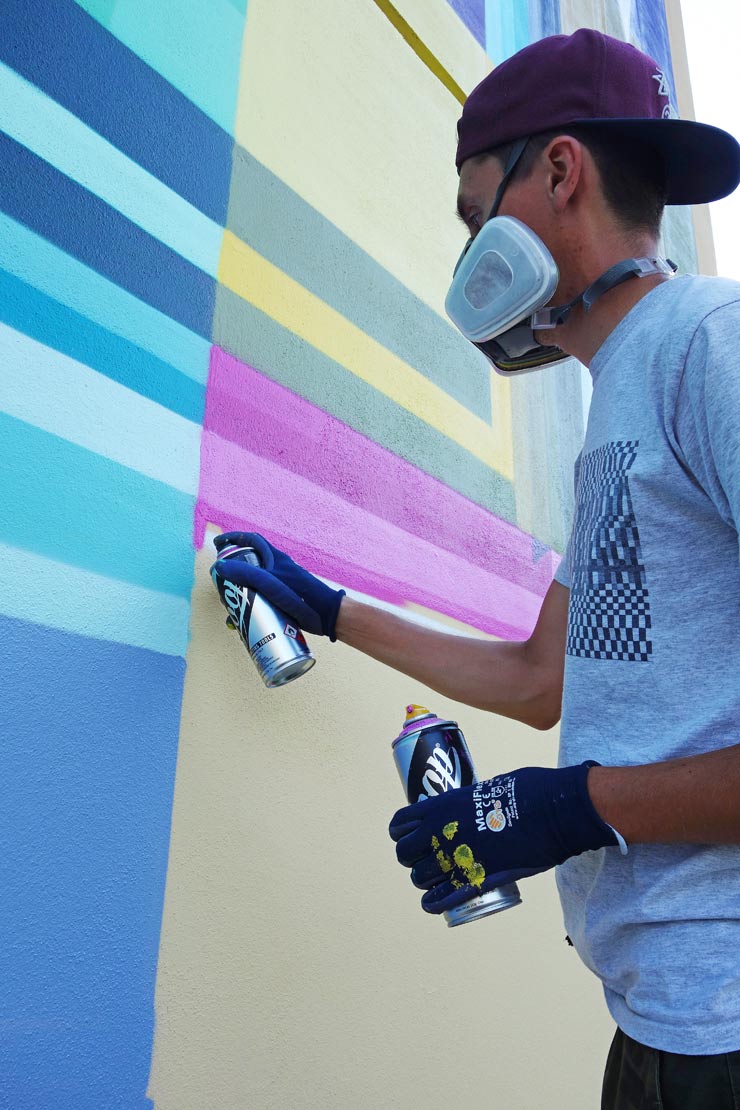 An fan and experienced practitioner of the traditional graffiti letter form, Lost Optics says that he is updating his personal practice by defragmenting them – perhaps feeding them through a refracting optic glass? With modern elements of glitch and pixel art, you can see how this new mural may be his interpretation of urban in the context of digital media.