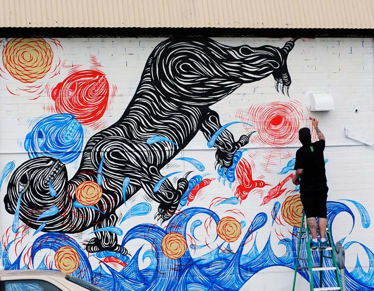 An interesting aspect of this event, and there were many, was the pairing of many artists on walls to combine and merge their styles to create new works. “There were a surprising number of unusual collaborations at Pow! Wow!,” says Martha. “Some were odd mashups like Tatiana Suarez and Woes, and Buff Monster and Nychos seemed like a good match. I think it must have been challenging for the artists. Cope & Indie also asked Buff Monster and 123Klan to collaborate on their wall.”