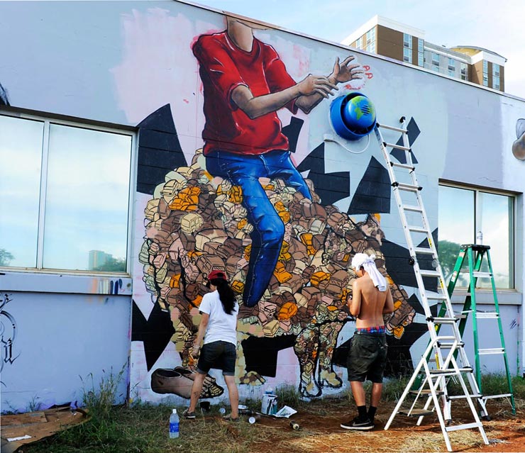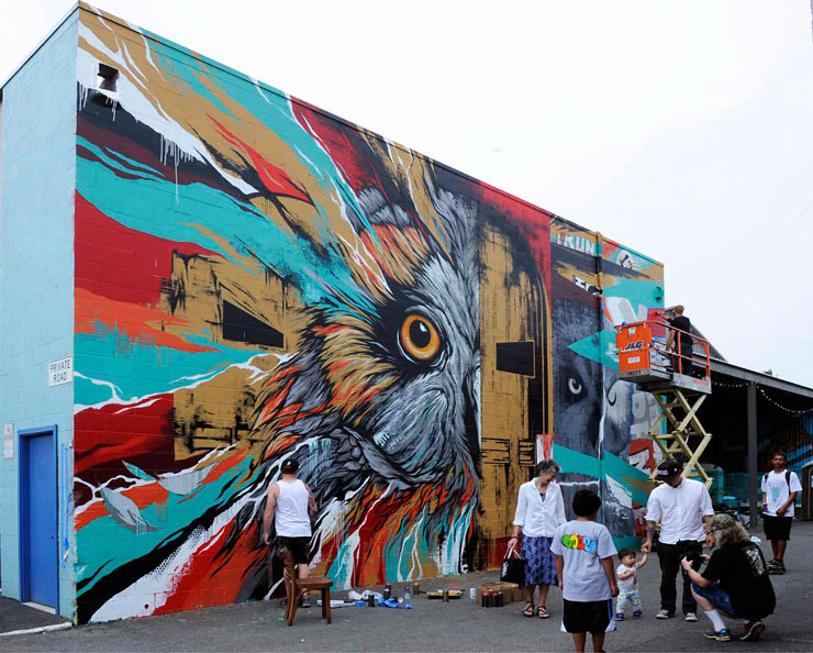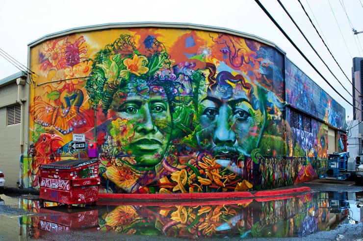 Kaka’ako is the name of the neighborhood where most of the murals are located and Ms. Cooper compares it to the Miami site that also has hosted a large number of legal walls for the last few years. “It’s a Wynwood-type neighborhood but with a longer, more esteemed history,” she says, and “Like Wynwood it’s slated for development.” For example a library that many of the local Hawaiian artists painted will soon be torn down to make space for condos. Good thing Street Artist Gaia and Vhils were there to bring some of the local historical and mythological elements, including portraits of Hawaiian royalty.