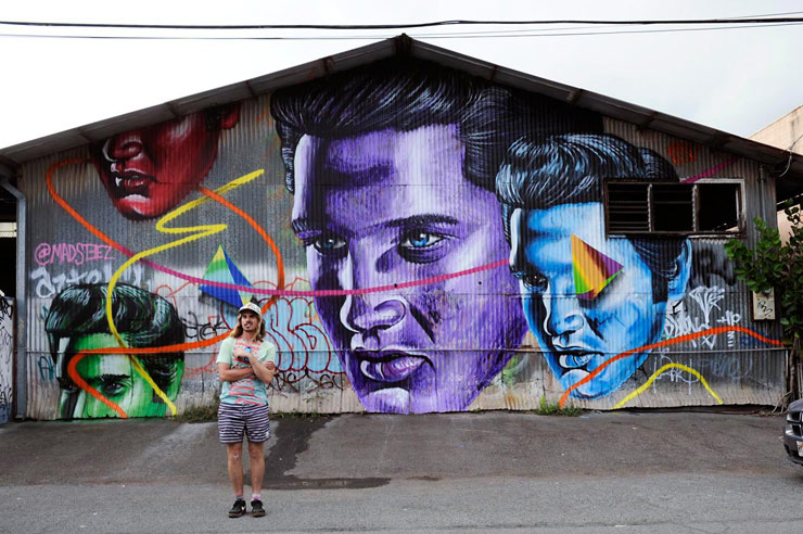 Another trend this year: Elvis. “Elvis is big in Hawaii,” Martha remarks, and she says it is because of his celluloid records in addition to his vinyl ones. “He made three movies in Hawaii,” and she mentions the Elvis mask that Wayne White made as a good example of Presley magic on the tropical island of Honolulu. “I especially liked the way Madsteez incorporated existing graffiti into his wall because he made good use of the corrugated iron surface which was difficult to paint on but it had a nice patina when finished.” Interestingly, Madsteez gave his blue Elvis an eye patch that mimics the artist’s own worldview.