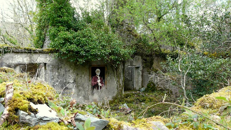 Irish Street Artist and realist painter Fintan Switzer has completed a new outdoor painting entitled “Alice Doesn’t Live Here Anymore”, which debuts here on BSA for you dear reader. With an abandoned lot that is overgrown with green framing his new piece, you may think you’ve entered a curated museum show. The placement may cause you to infer that you are seeing a previous inhabitant; a slightly stern or worried expression crosses the face of a man who pauses for a moment while sweeping to answer a visitor’s inquiry.