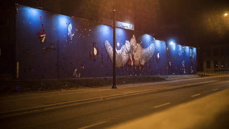 Here the graduate of the Katowice Academy of Fine Arts takes advantage of a low wide wall to breathe space between floating elements that she hand painted in great detail. Incorporating lighting that is specific to the piece on Gdańska 132 st, night time evokes a celestial and quietly gleaming scene while the stained glass and varied 3 dimensional elements cast shadows and change hue throughout the day movement of the sun across this southern-facing wall.