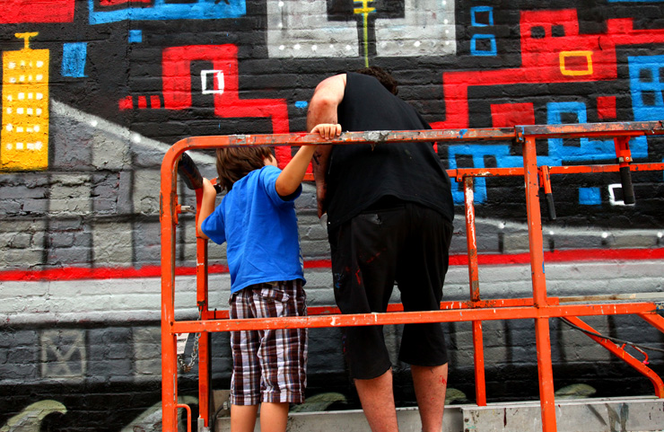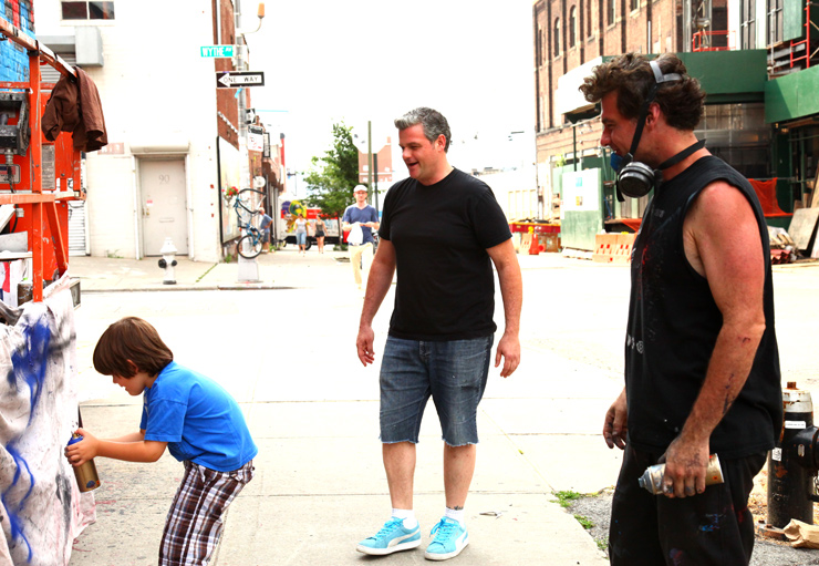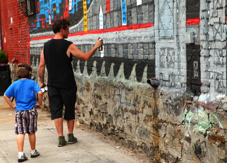 The steady stream of inquisitors on this street and the unsolicited advice and comments brought a smile to Ads’ face and a wisecrack to his lips often. In particular he liked the observation that a guy had about the two crossed boxes he tagged in the yellow patch of color in the corner. “I like the eyes you put in the sun,” he told the artist. Others just stopped to take pictures or even get their picture taken with Skewville. At one point it was a family affair as Ad and Droo and his young son were all spraying with the aerosol – as the youngster tried his luck first on a dropcloth with the pros giving advice, and then he hit the wall with two hands clasped around the can. Good to see Father’s Day weekend in full effect and the skillz being passed down to the next generation.