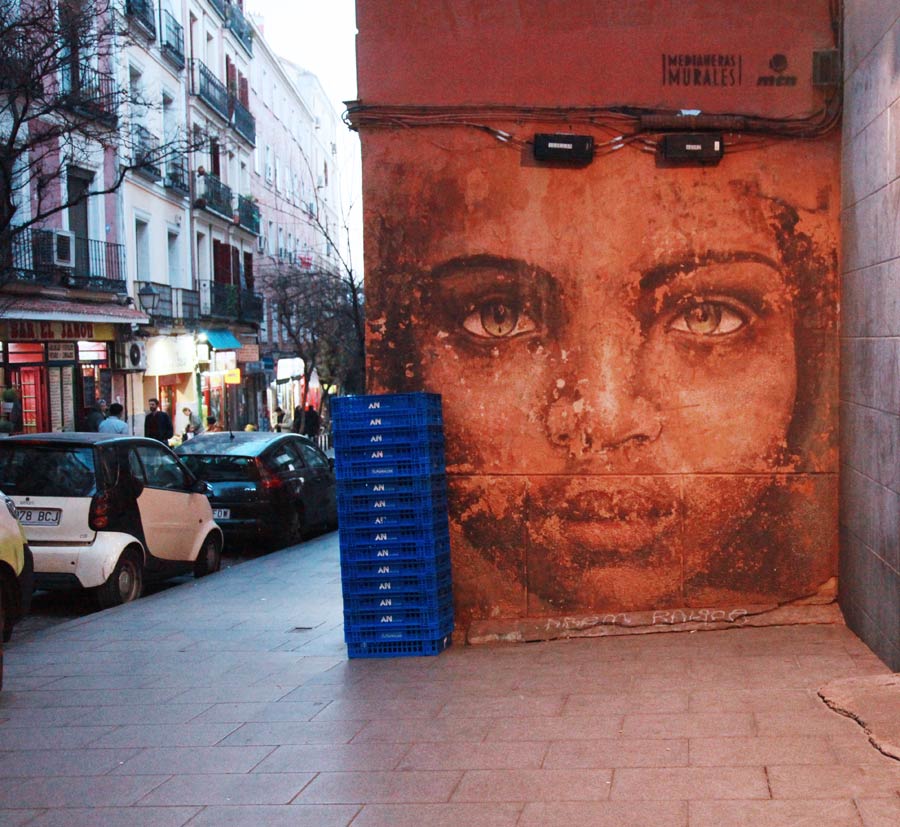 More on that studio visit later, along with the crew of artists whom Okuda is curating for tomorrow nights’ Theriomorphism show. Today we bring you some fresh shots of his brand new mural in Lavapiés, a run-down yet exotically rendered old part of Madrid that teams with graffiti and new immigrants from the Indian subcontinent, China, a smattering of Arabs and a spectacular selection of Senegalese. This kind of cultural hybrid always produces the most scintillating and surprising results; perfect soil for this new collaboration as well.