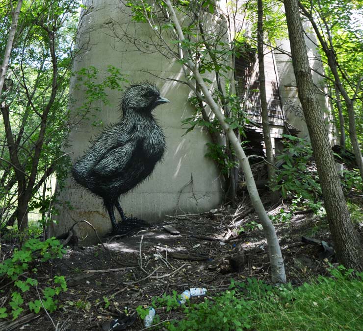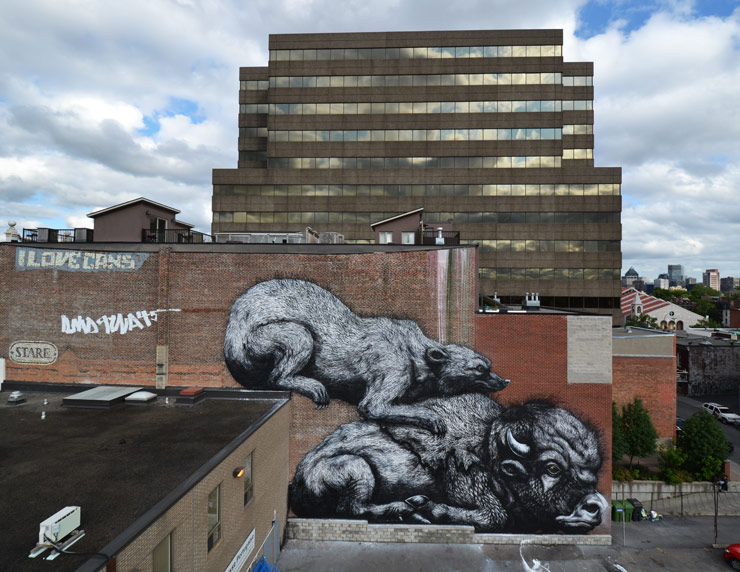 “For his first visit to Montreal, the Belgian Street Artist named ROA says that he had a great time creating this ‘still life’ with a bison and a bear. When talking about his inspiration, ROA says that he was impressed with the history of the so-called American bison, which was incredibly abundant in the early 19th century, numbering more than 40 million. After being hunted almost into extinction with a population of 200 a century later, the bison slowly have reestablished their numbers in Canada to 700,000. He decided to add a bear laying on top because it tells a similar story of a native mammal in the region.”