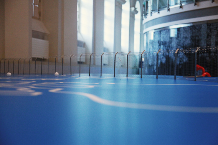 Domo Collective present “Fair Play III” an enormous world map functioning ping pong table with a triple razor wire fence right down the middle. “We play an unhealthy game in which nobody believed to be responsible.” At Artmossphere 2016 in Moscow. Photo ©Jaime Rojo