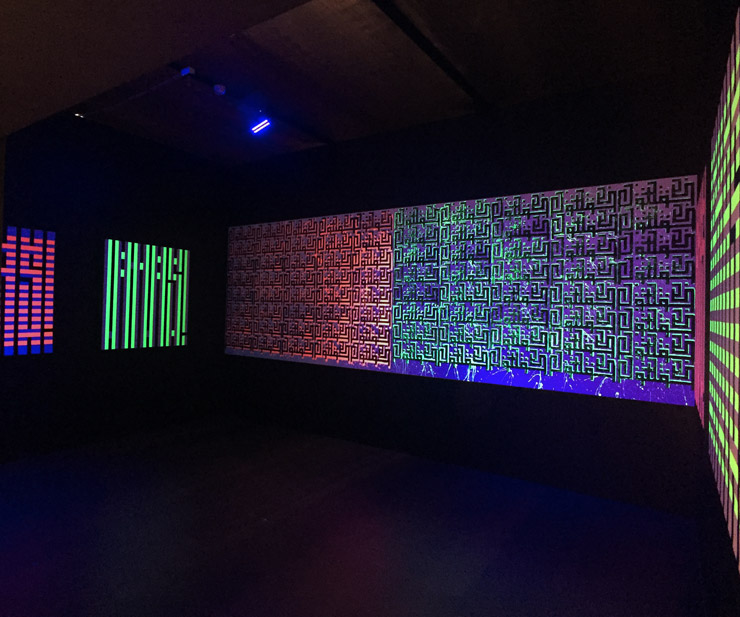 The inside installation by L’Atlas for Artmossphere features multiple abstract iterations of his tag in day glo. photo © Jaime Rojo
