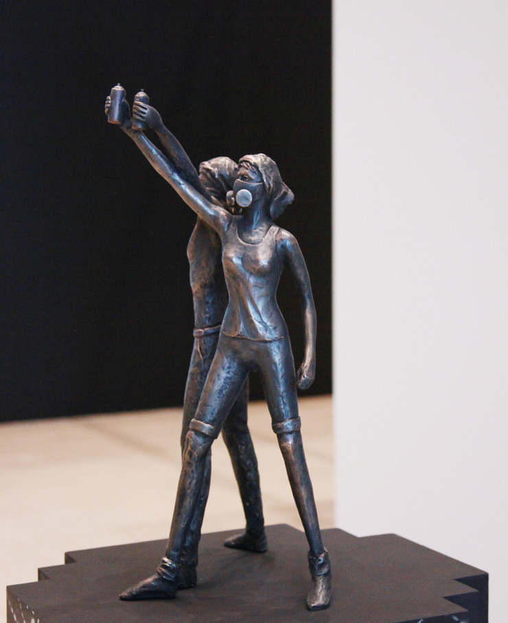 Warsaw based NeSpoon creates a sculpture of another couple. Heroically presenting her vision of what she calls the iconic “Graffiti Writer” and “Street Art Girl”, they face the future with art instruments in hand ready to make their respective marks. She says her work is emblematic of a permanent financial insecurity for a generation she calls the “PRECARIAT”.