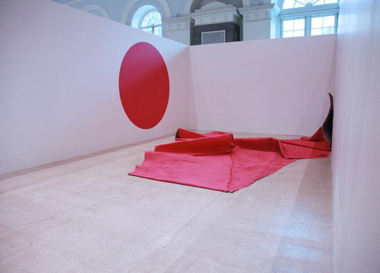 “I said ‘you know what?’ – I want to do something with the cheapest materials you can possibly get. These two pieces literally cost 3000 rubles ($50). It’s made of felt, it’s like a lambs wool. I think they use it for flooring for construction.” Depending on the angle, the pink blotted material may translate as a swath of otherworldly terrain or a metaphorical bold vision with all the hot air let out.