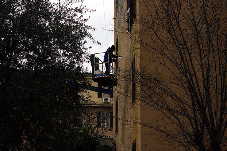 The first thing you’ll notice is that all the walls are the same size. For “Big City Life Rome” all of the artists were given equally large walls for their murals, which is good because you avoid fights that way. We have seen a few festivals where there are heated discussions about which artists have what walls, how large or small they are, and where they are located. This sort of uniformity is rather unique in that way.