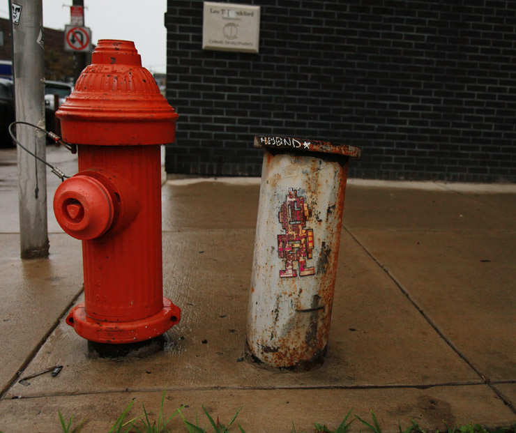 When you see one of these unemotional little fellas you cannot be sure if it is new or more than 20 years old, since he began appearing that long ago. Not showy nor preening, he certainly is versatile and colorful, appearing on record covers, playing cards, riding airplanes… and in a number of prints and pieces in a handful of small street art/graffiti centric galleries the last few years. He can appear as a sole figure on the street and can be remixed into vintage photos or illustrations, shape-shifting and implicating himself into other time periods and other worlds.